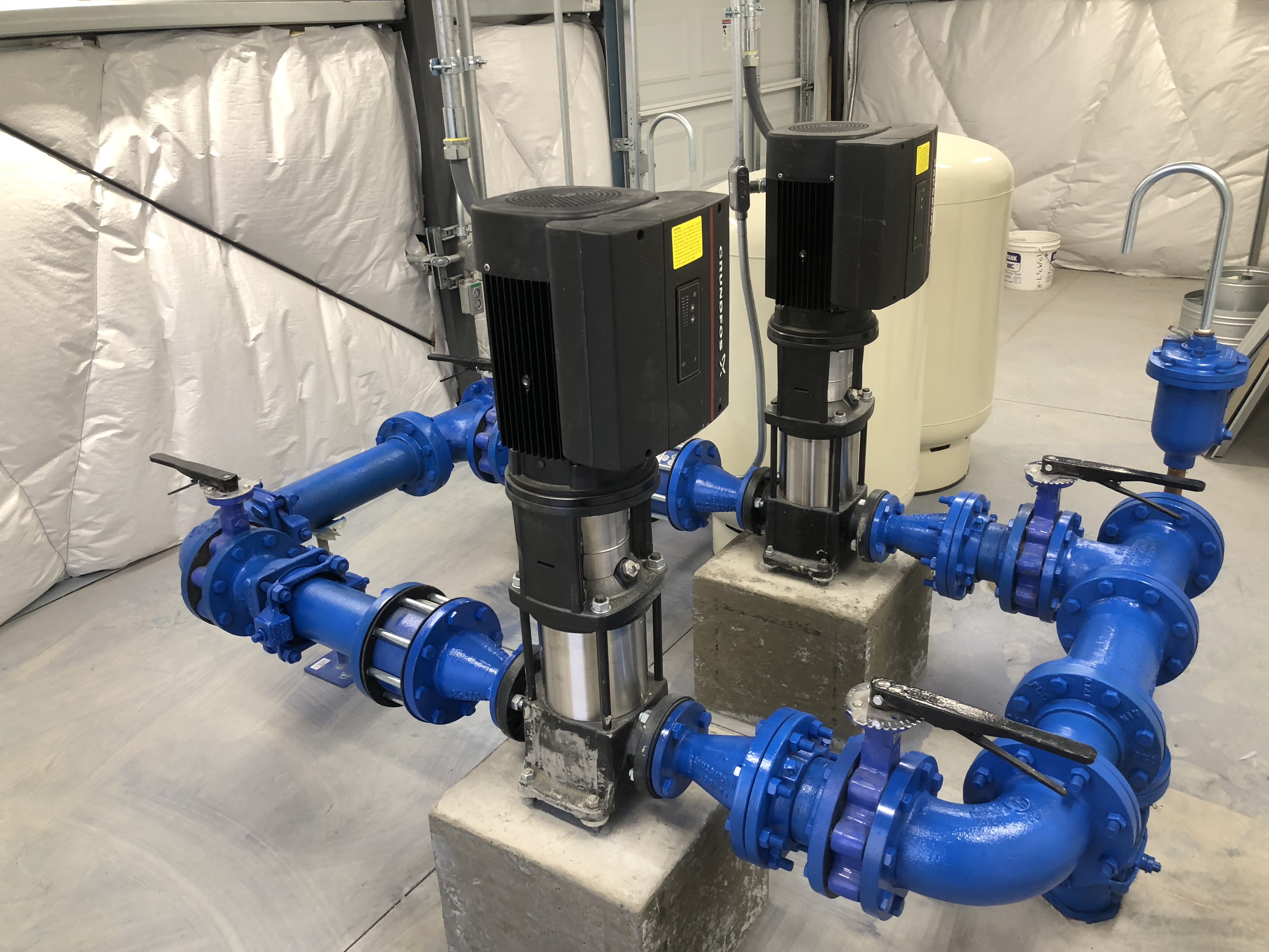 Variable speed multi stage booster system. Great for a wide range of flow rates at constant pressures. Pictured is station capable of up to 300 gallons per minute @ 60 PSI. Potable system at Nye County Complex.
